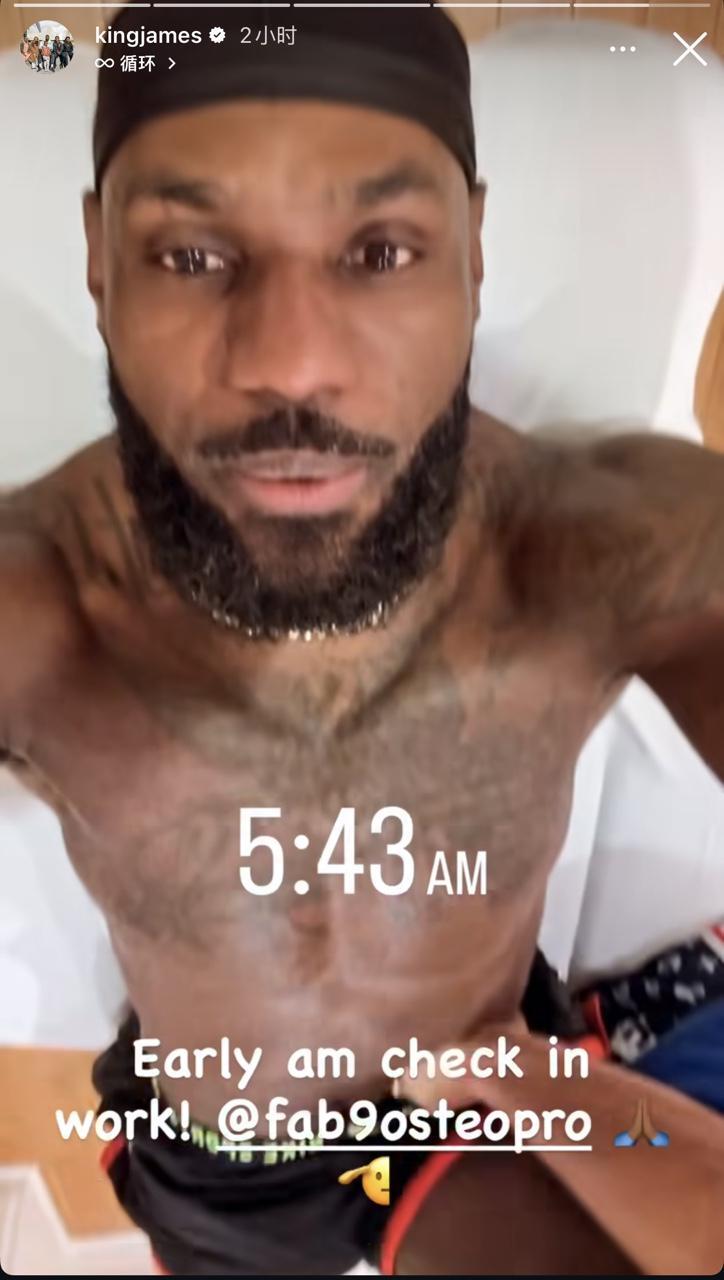 詹姆斯配文写道:“凌晨5点43分,早间的训练打卡!”值得一提的是,此前詹姆斯就曾连续五天凌晨三点至四点期间打卡训练。