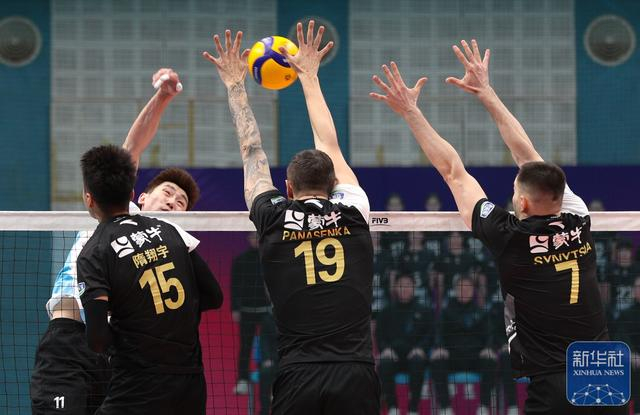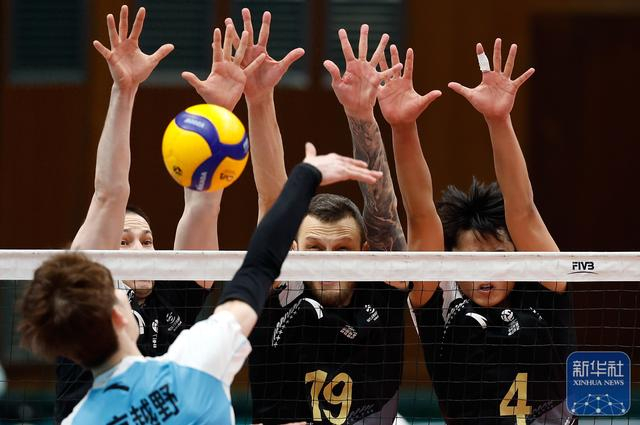 ↑ 保定沃隶队球员隋翔宇、康斯坦丁、辛尼察(前排从左至右)在比赛中拦网北京北汽队球员江川。新华社发(马子涵摄)