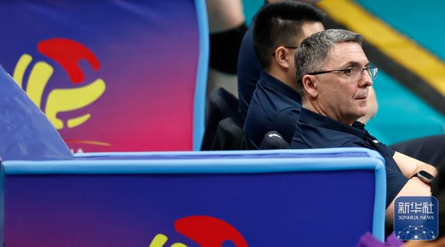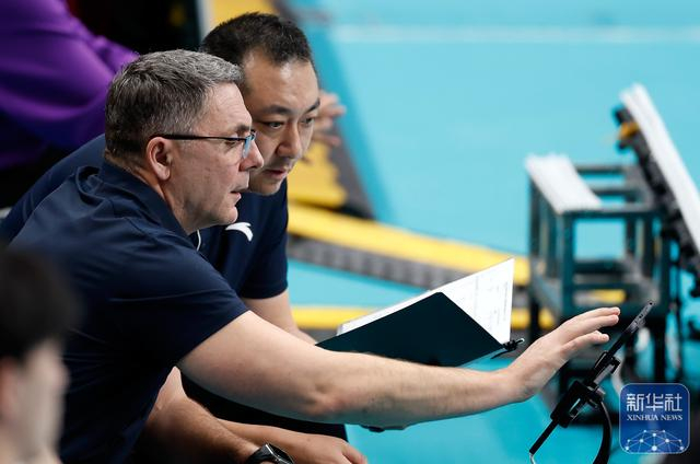 ↑ 保定沃隶队助理教练拉特科·佩里斯(右)在场边观赛。新华社记者 王丽莉 摄